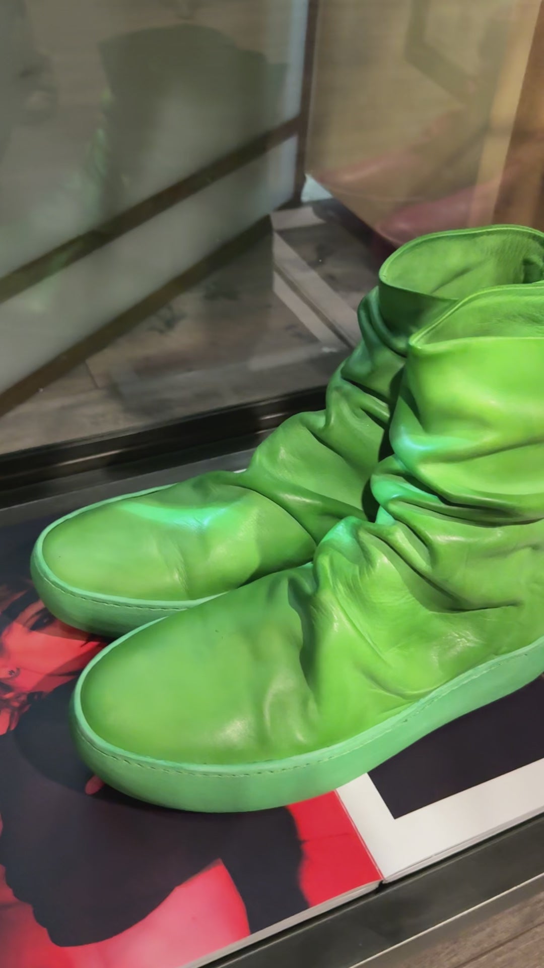 Description: Green high-top sneakers crafted from premium leather, featuring a unique ruched design and a sturdy rubber sole.