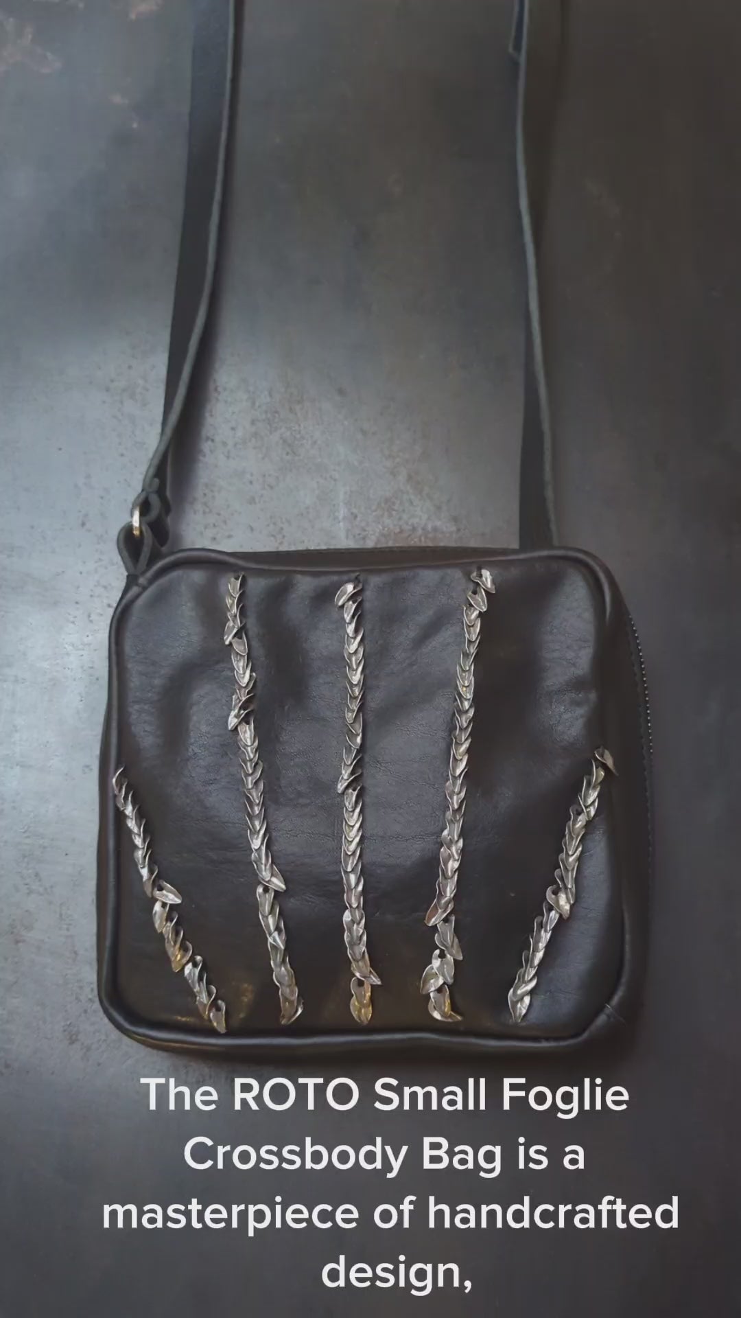 The ROTO Small Foglie Crossbody Bag is a masterpiece of handcrafted design, combining timeless style with bold, intricate details. Made from premium vegetable-tanned bull leather, this bag features an exceptional hard hand feel that promises durability and elegance. Adorned with meticulously hand-applied 925 silver leaves, the bag's artistic embellishments evoke a sense of luxury and individuality. A sleek, compact size makes it the perfect choice for carrying your essentials, while its adjustable leather strap ensures versatile wear.