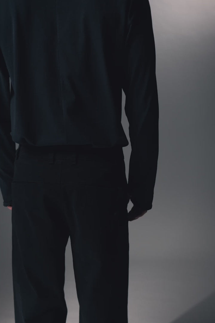 Wide-fit trousers made from a stretch cotton and wool blend, garment-dyed for a unique finish. These trousers feature a button fly, belt loops, angled front pockets, and back pockets aligned with the yoke. Crafted with durable stitching in thick cotton thread, they are designed for both comfort and style.