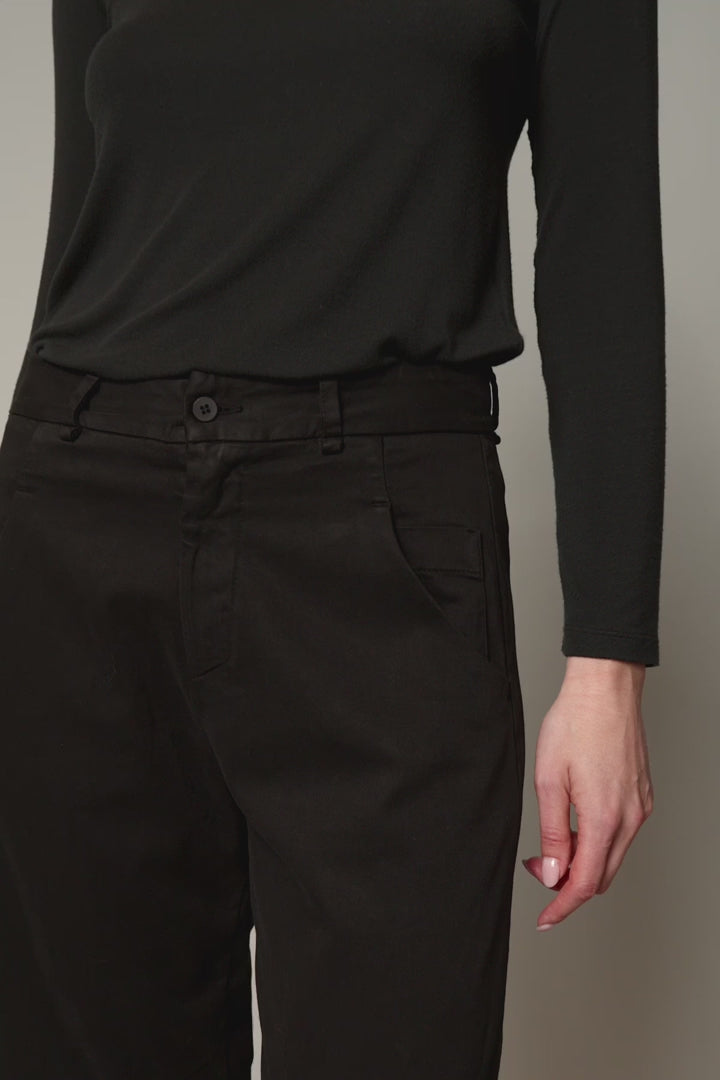 A pair of garment-dyed trousers with a comfortable fit, crafted from a blend of stretch cotton, modal, and Tencel. Featuring a button and zip fastening, these pants include belt loops and slash pockets. The loose legs incorporate front darts and vents, while the back has a mock welt pocket with a vertical cut to the hem.