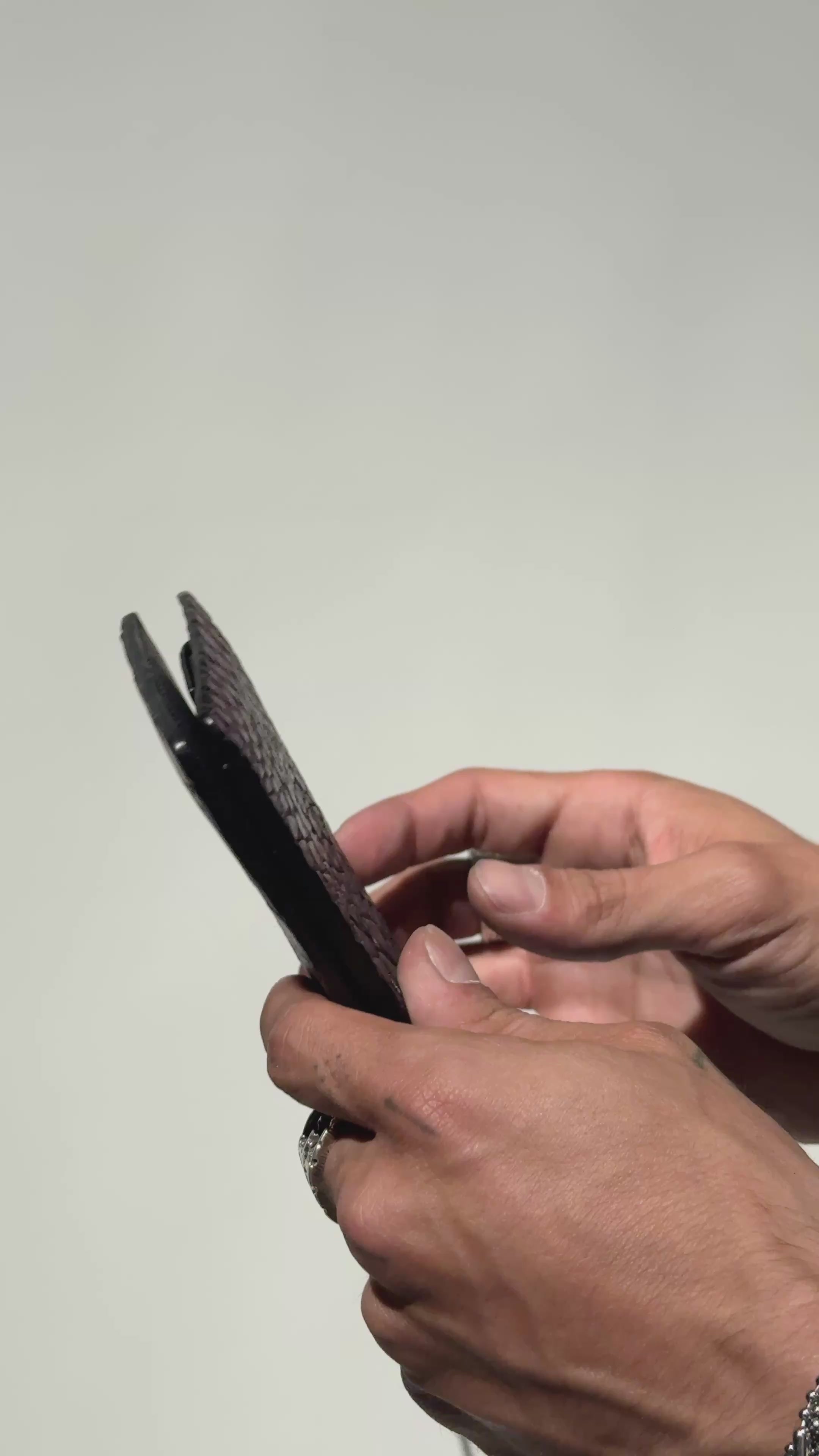 This handcrafted wallet from Isaac Sellam embodies a refined balance between craftsmanship and contemporary design. Constructed entirely from genuine alligator leather, it presents a structured, articulated form enriched with staple seam details and subtle leather cord accents. Each piece undergoes a meticulous hand-dyeing process, resulting in a singular surface texture and tone that emphasize the individuality of the leather. The compact layout includes three card slots and a dedicated coin compartment, providing functional organization within a sculptural silhouette.