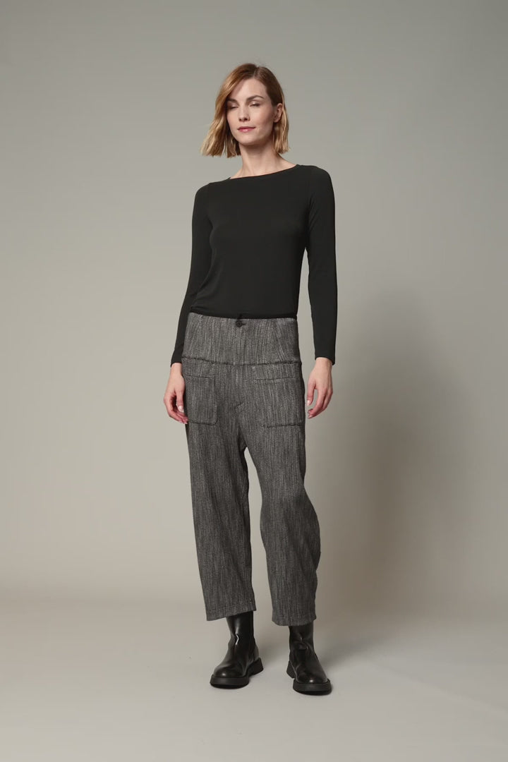 Low-crotch trousers featuring a relaxed fit with a slight curve, crafted in a wool blend with a micro-patterned texture. They include a high ribbed waistband, front patch pockets, and a hemmed knit basque for added style and comfort.